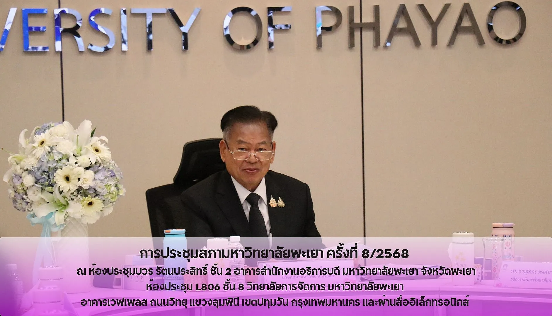 วันเสาร์ที่ 13 ธันวาคม 2568 ศาสตราจารย์พิเศษอรรถพล ใหญ่สว่าง นายกสภามหาวิทยาลัยพะเยา เป็นประธานการประชุมสภามหาวิทยาลัยพะเยา ครั้งที่ 8/2568 ณ ห้องประชุมบวร รัตนประสิทธิ์ ชั้น 2 อาคารสำนักงานอธิการบดี มหาวิทยาลัยพะเยา จังหวัดพะเยา ห้องประชุม L806 ชั้น 8 วิทยาลัยการจัดการ มหาวิทยาลัยพะเยา อาคารเวฟเพลส ถนนวิทยุ แขวงลุมพินี เขตปทุมวัน กรุงเทพมหานคร และผ่านสื่ออิเล็กทรอนิกส์
