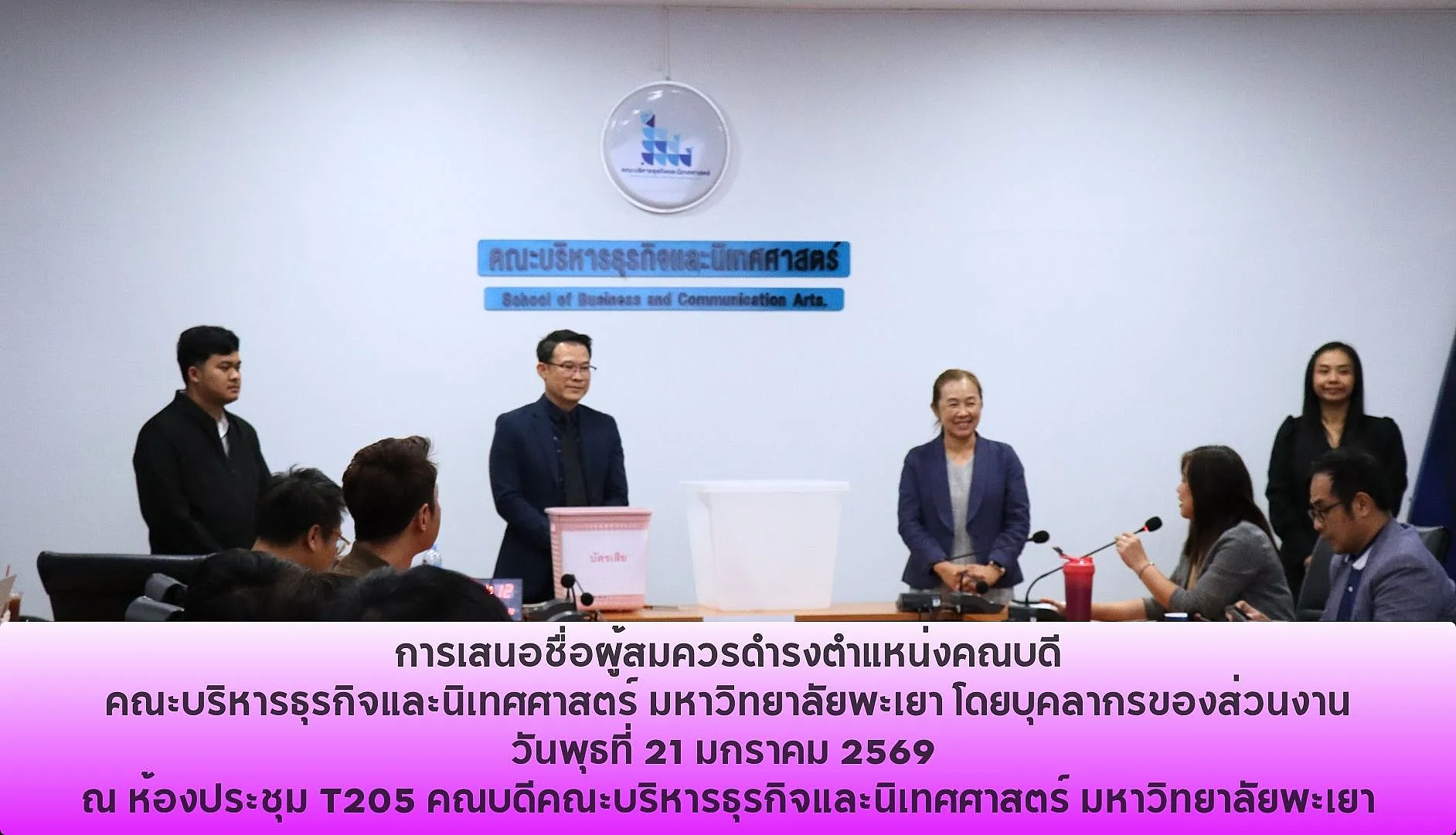 เมื่อวันพุธที่ 21 มกราคม 2569 คณะอนุกรรมการ ประจำหน่วยเสนอชื่อโดยบุคลากรของส่วนงาน โดย รองศาสตราจารย์ ดร. เอกสิทธิ์ วงศ์ราษฎร์ ประธานสภาพนักงานมหาวิทยาลัยพะเยา เป็นประธานอนุกรรมการ และสำนักงานสภามหาวิทยาลัยพะเยา เป็นฝ่ายเลขานุการ ได้ดำเนินการตั้งหน่วยเสนอชื่อผู้สมควรดำรงตำแหน่งคณบดีคณะบริหารธุรกิจและนิเทศศาสตร์ มหาวิทยาลัยพะเยา โดยบุคลากรของส่วนงาน