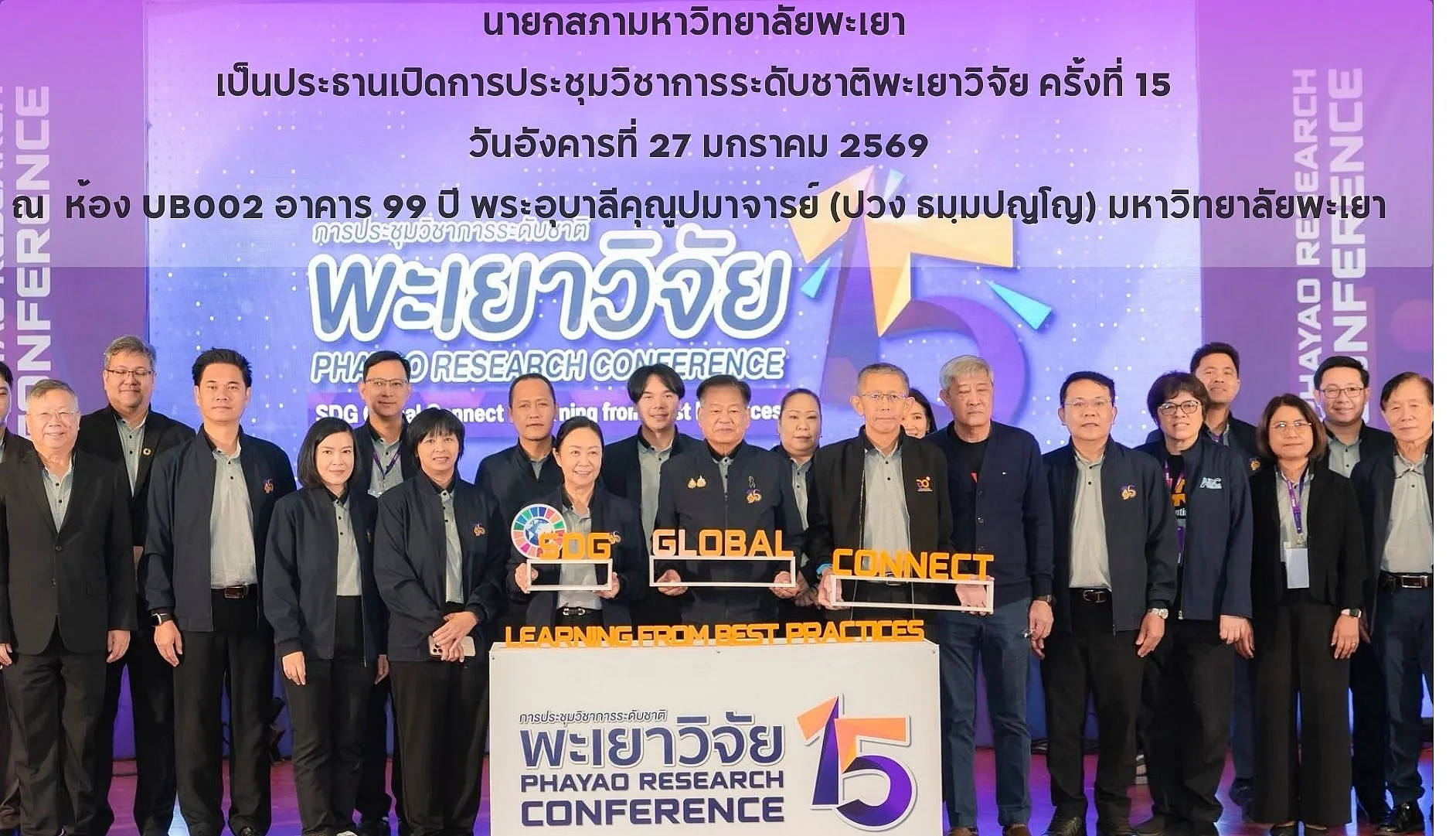 เมื่อวันอังคารที่ 27 มกราคม 2569 เวลา 09.00 น. ศาสตราจารย์พิเศษอรรถพล ใหญ่สว่าง นายกสภามหาวิทยาลัยพะเยา เป็นประธานเปิดการประชุมวิชาการระดับชาติ “พะเยาวิจัย ครั้งที่ 15” ภายใต้หัวข้อ “SDG Global Connect : Learning from Best Practices” ระหว่างวันที่ 26-27 มกราคม 2569 โดยกองบริหารงานวิจัย ณ ห้อง UB002 อาคาร 99 ปี พระอุบาลีคุณูปมาจารย์ (ปวง ธมฺมปญฺโญ) มหาวิทยาลัยพะเยา