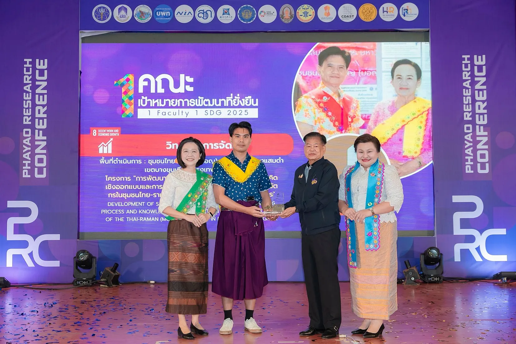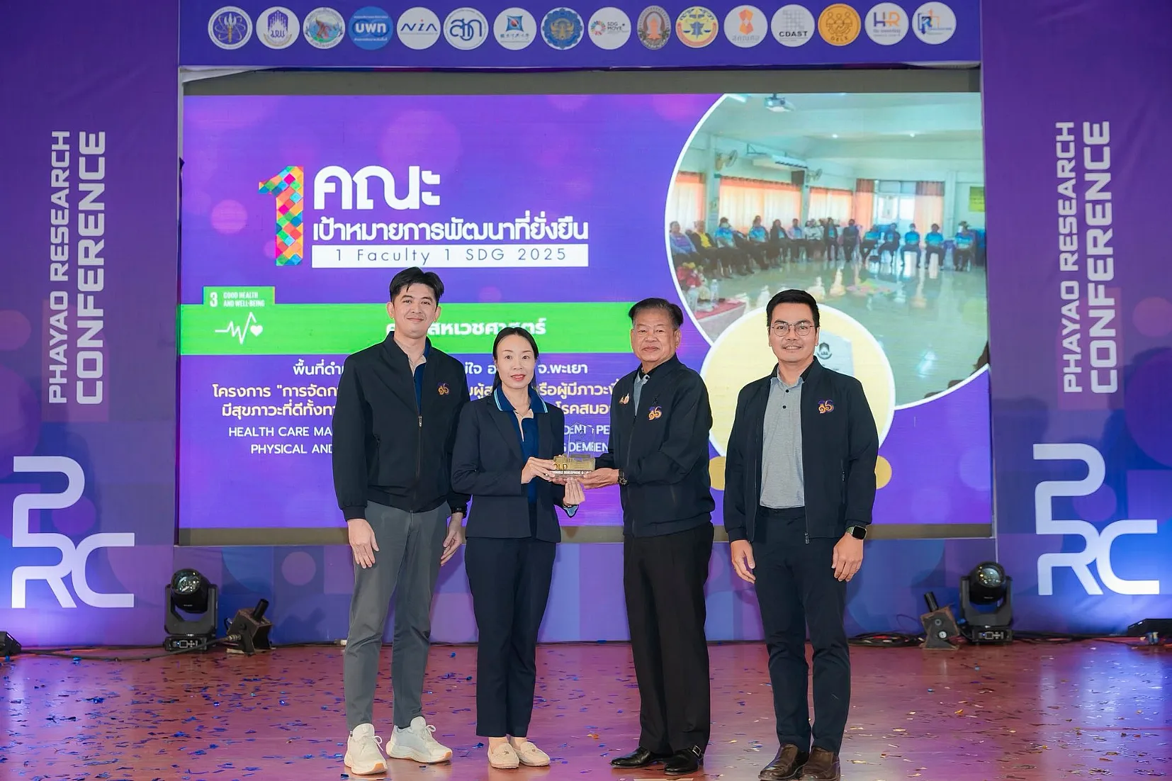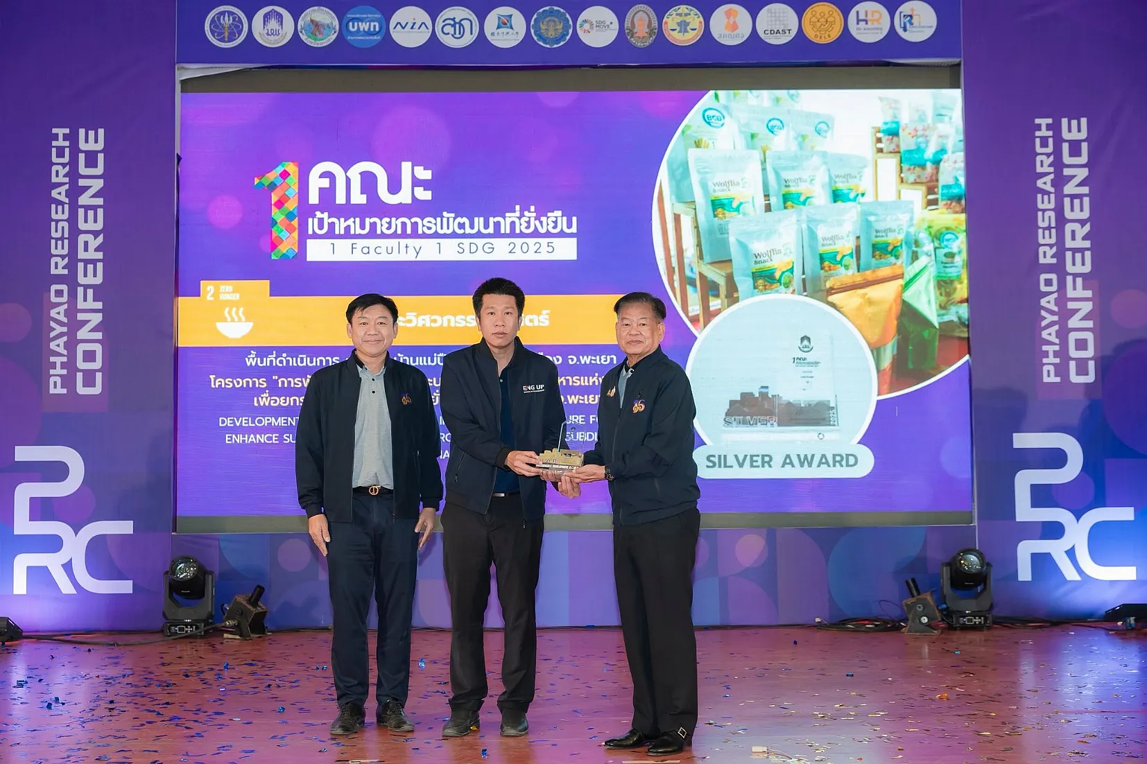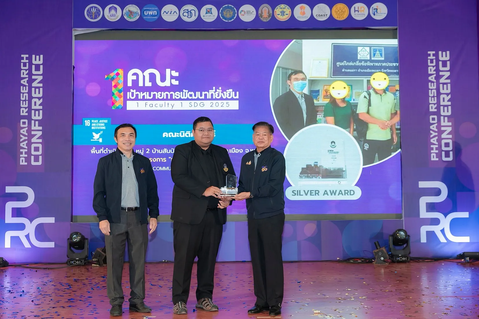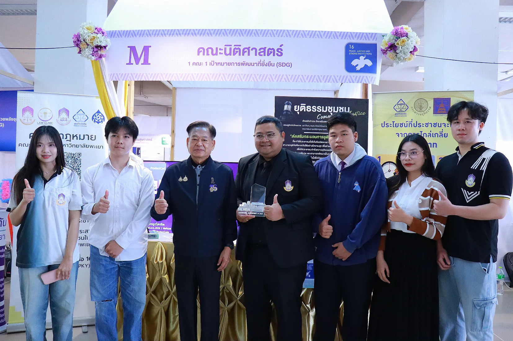 จากนั้น นายกสภามหาวิทยาลัยพะเยาให้เกียรติมอบรางวัลเพื่อยกย่องและสร้างขวัญกำลังใจให้แก่นักวิจัยและส่วนงานของมหาวิทยาลัย รางวัลผลการดำเนินงาน “1 คณะ 1 SDG ประจำปี 2568” พร้อมทั้งเยี่ยมชมนิทรรศการผลงานนวัตกรรมเพื่อสังคมของส่วนงานภายในมหาวิทยาลัย และหน่วยงานภายนอกมหาวิทยาลัยที่ร่วมจัดนิทรรศการ ซึ่งสภาทนายความในพระบรมราชูปถัมภ์แห่งประเทศไทยได้ร่วมจัดการนำเสนอผลงานวิจัยในรูปแบบ Poster และ Oral Presentation นำโดย ดร. ธนพล คงเจี้ยง นายกสภาทนายความ โดยงานนี้ได้รับความสนใจจากผู้บริหาร คณาจารย์ บุคลากร นิสิต และประชาชนทั่วไป เข้าร่วมเป็นจำนวนมาก
