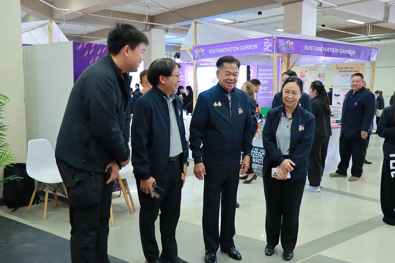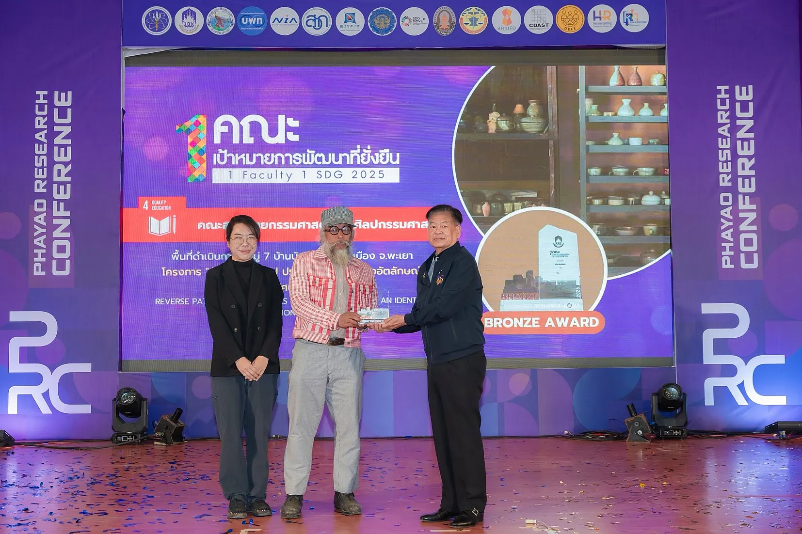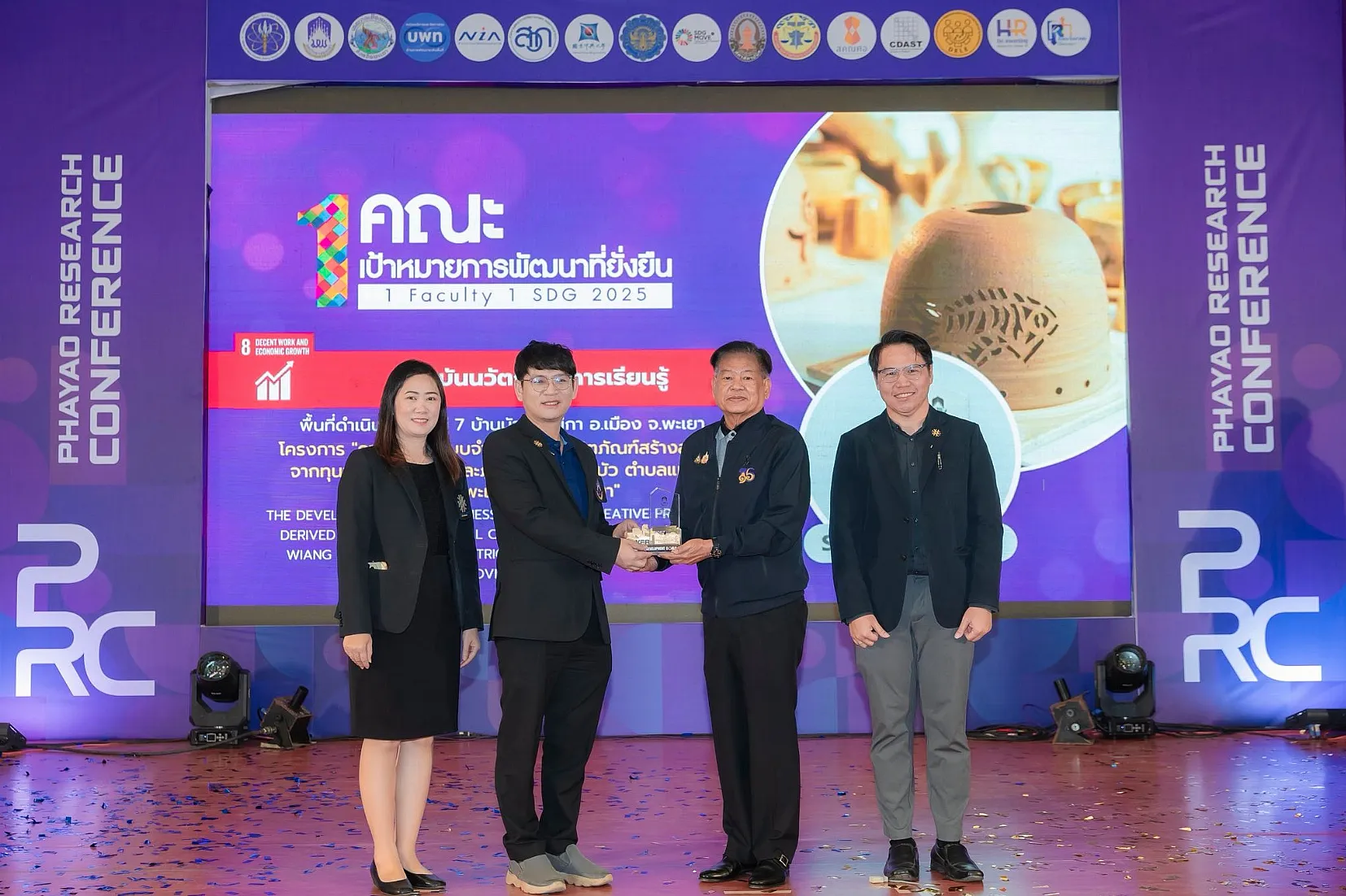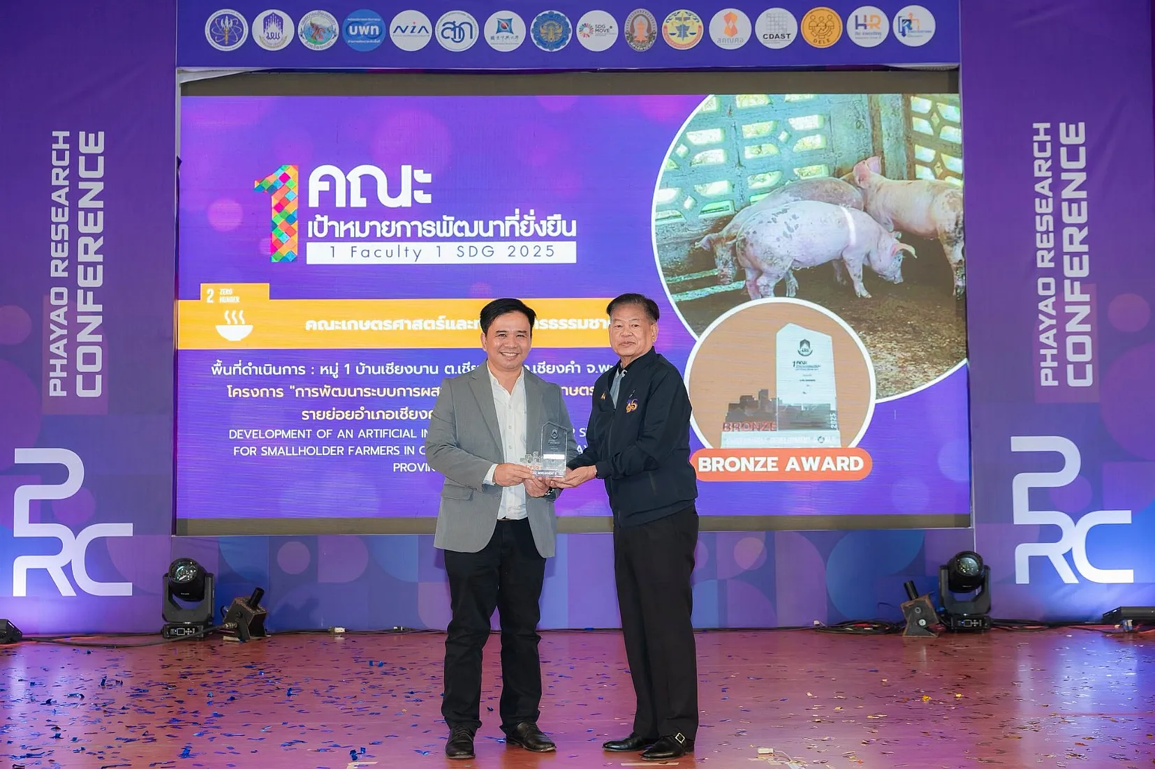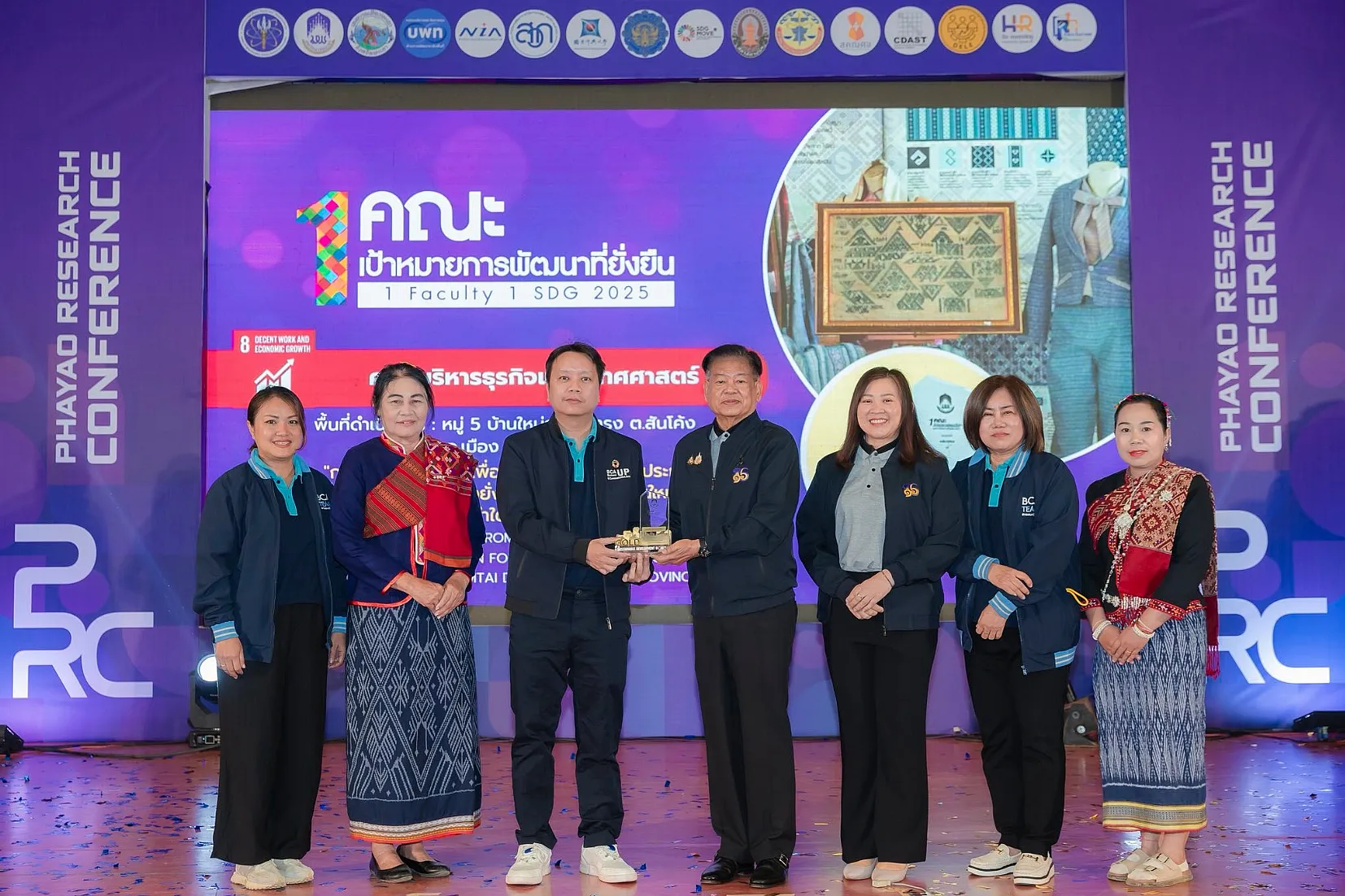 จากนั้น นายกสภามหาวิทยาลัยพะเยาให้เกียรติมอบรางวัลเพื่อยกย่องและสร้างขวัญกำลังใจให้แก่นักวิจัยและส่วนงานของมหาวิทยาลัย รางวัลผลการดำเนินงาน “1 คณะ 1 SDG ประจำปี 2568” พร้อมทั้งเยี่ยมชมนิทรรศการผลงานนวัตกรรมเพื่อสังคมของส่วนงานภายในมหาวิทยาลัย และหน่วยงานภายนอกมหาวิทยาลัยที่ร่วมจัดนิทรรศการ ซึ่งสภาทนายความในพระบรมราชูปถัมภ์แห่งประเทศไทยได้ร่วมจัดการนำเสนอผลงานวิจัยในรูปแบบ Poster และ Oral Presentation นำโดย ดร. ธนพล คงเจี้ยง นายกสภาทนายความ โดยงานนี้ได้รับความสนใจจากผู้บริหาร คณาจารย์ บุคลากร นิสิต และประชาชนทั่วไป เข้าร่วมเป็นจำนวนมาก